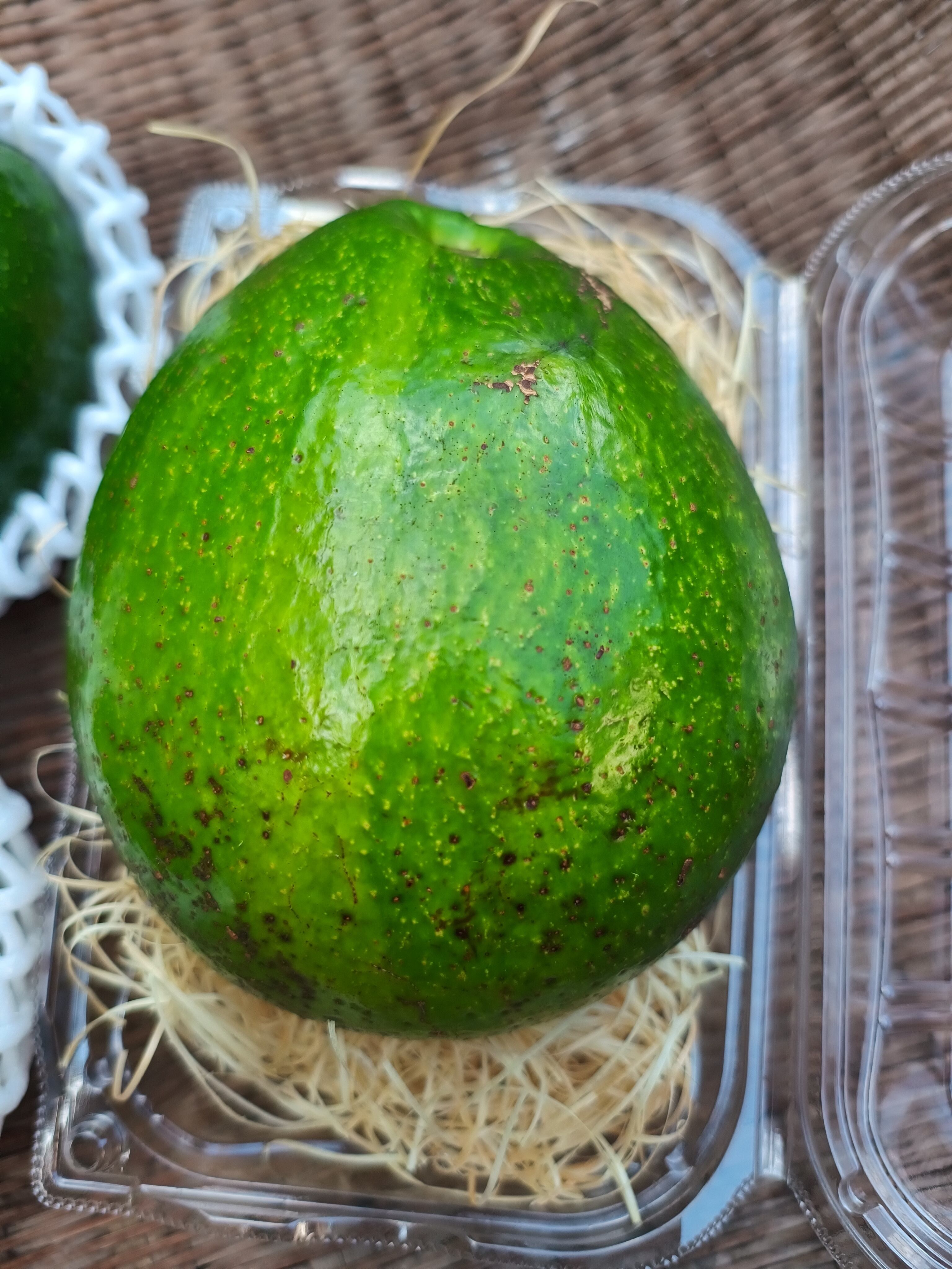 ミゲルという大玉(500g~1000g)品種です。グアテマラ系と西インド諸島系の交雑品種。クリーミーで濃厚なアボカドです。果皮は濃い緑色で厚みがありますが、手で剥きやすいです。成熟するとやや黄緑色や部分的に茶色になることがあります。